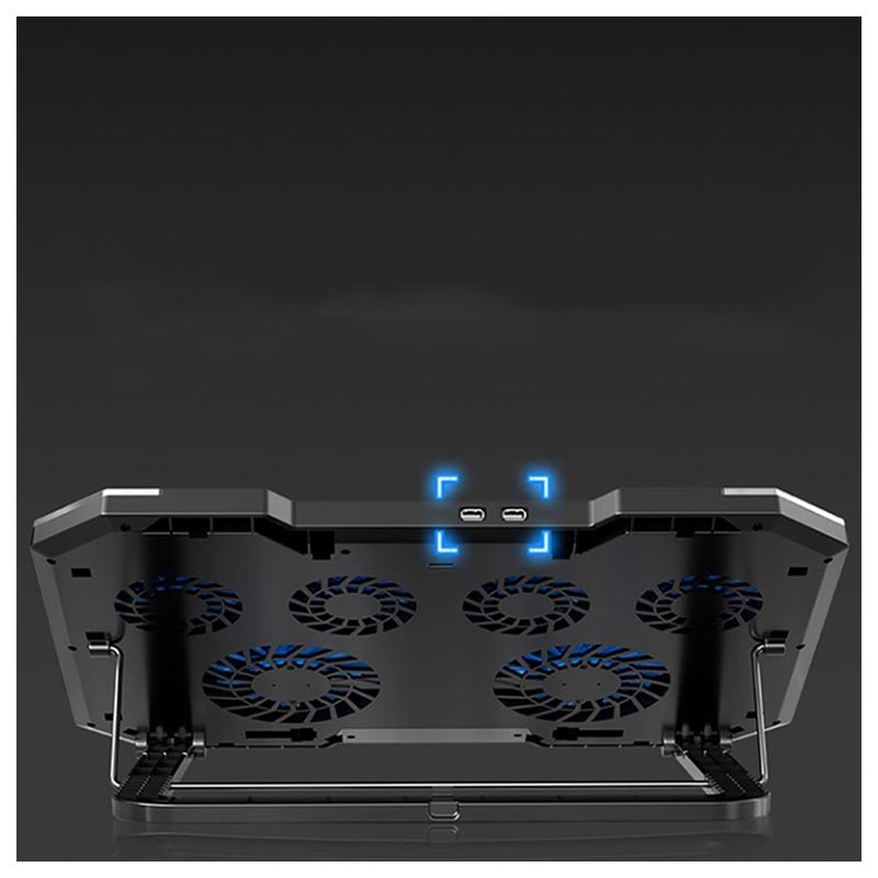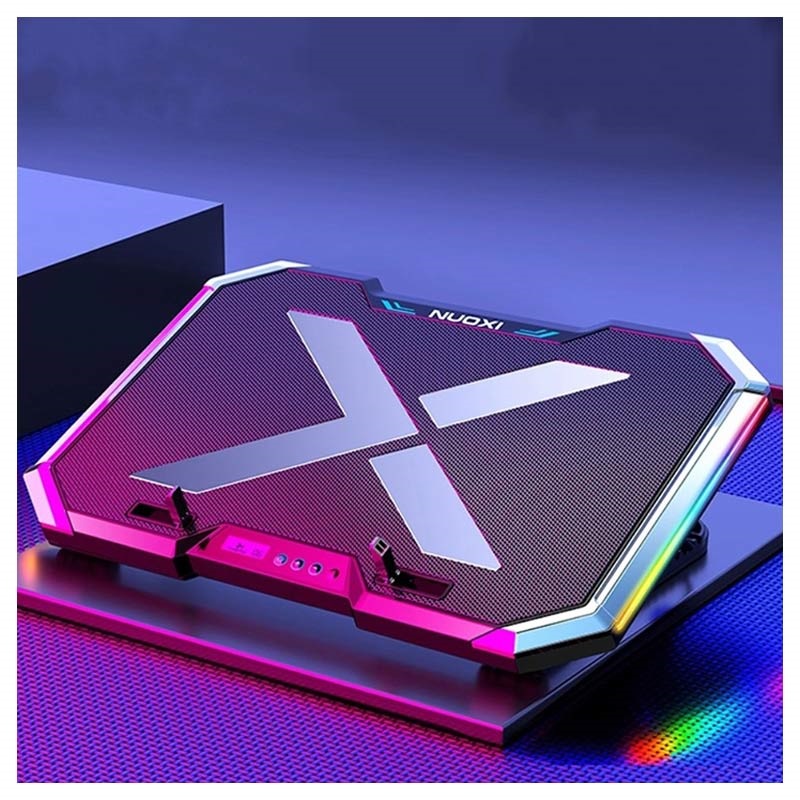 Nuoxi Q8 rashladna podloga je zgodno rešenje u slučaju kada se vaš laptop preterano zagreje. Opremljena je sa dva velika i četiri mala ventilatora, tako da obezbeđuje dovoljno protoka vazduha za vaš uređaj. Vaš laptop takođe može izgledati lepše i zanimljivije zahvaljujući RGB svetlosnim efektima koji se dešavaju oko baze podloge. Tu su i kontrolni tasteri i displej na prednjoj strani koji vam omogućuju da podesite brzinu ventilatora i svetlosne efekte, dok praktični poklopci omogućuju da vaš laptop stoji na mestu.