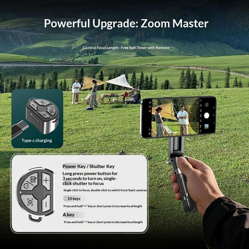 The included Bluetooth 5.2 remote control allows you to trigger photos and videos from up to 10 m away. It supports switching between front and rear cameras, zooming and focusing, giving you full control without touching your phone.