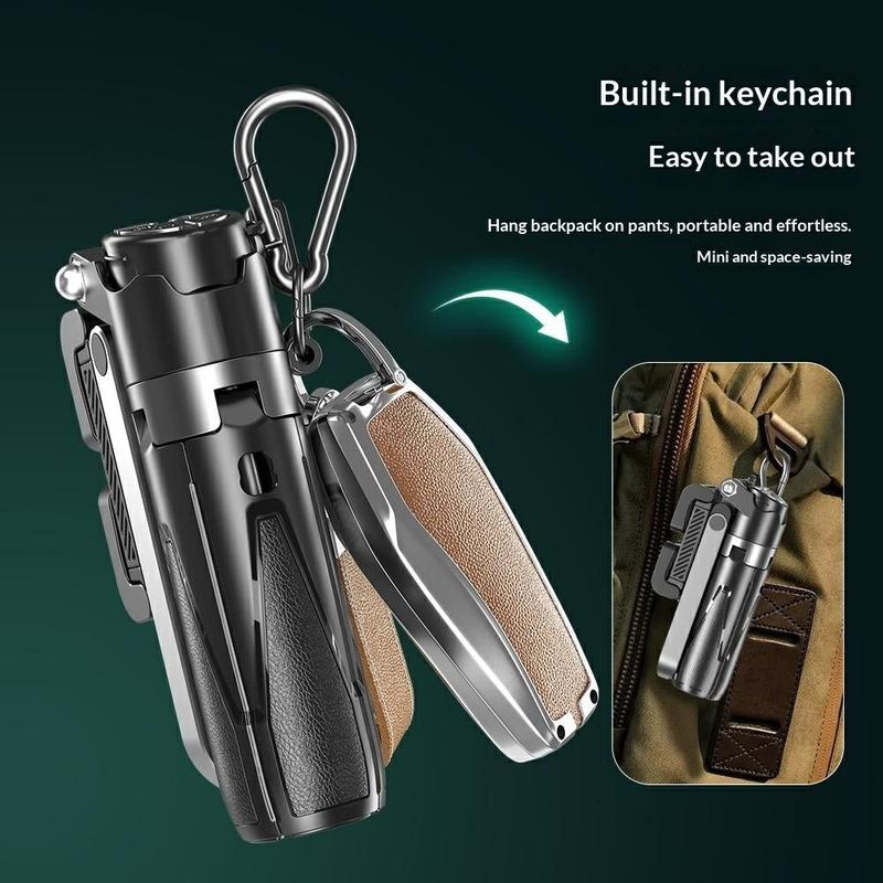 The four-leg tripod design with aluminium alloy support structure provides reliable stability on flat surfaces. A one-touch pop-up mechanism allows quick setup, making it easy to switch between handheld and desktop use.