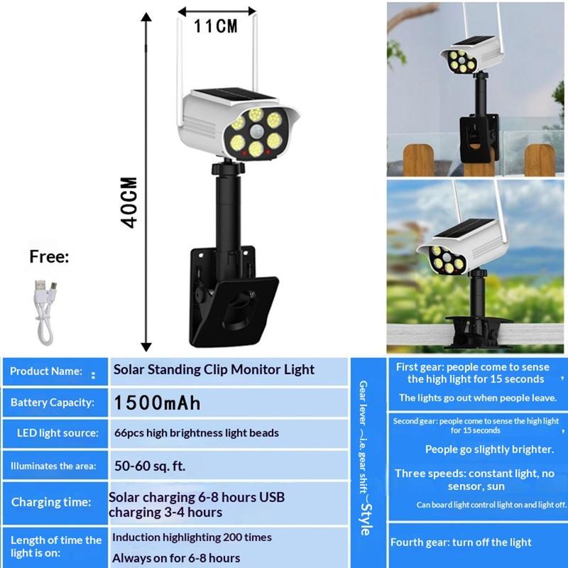 The P43 simulated security camera solar light is an IP44 waterproof outdoor LED motion sensor lamp with 66 LEDs, a 1500mAh battery, and automatic dusk-to-dawn light control. Featuring a realistic dummy camera design, adjustable 360 positioning, and flexible clip mounting, it is a practical solar lighting solution for gardens, entrances, balconies, fences, and driveways.