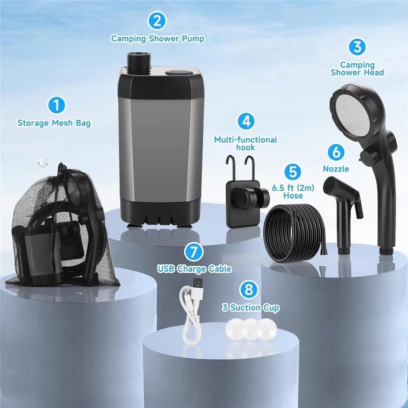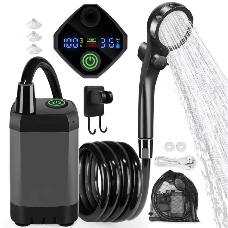 This portable electric shower pump is designed to make outdoor washing easier, more comfortable, and more flexible wherever you go. With a built-in 6000mAh battery, IPX7 waterproof protection, and a smart digital display, it is a practical choice for camping, RV travel, beach trips, hiking, pet washing, and outdoor cleaning. Its cordless design and complete accessory kit help you enjoy a more convenient shower setup without relying on a fixed water source or power outlet.