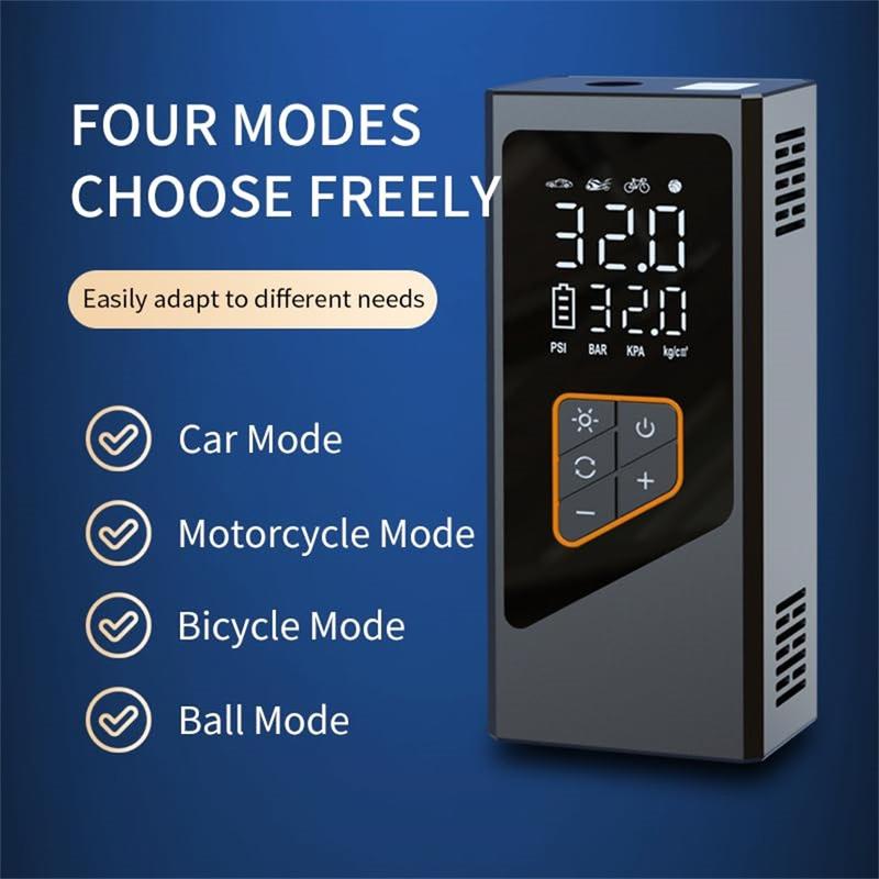 - Preset Inflation Modes - Offers 5 inflation presets for different needs: Car 26-50 PSI, Motorcycle 26-45 PSI, Bicycle 30-65 PSI, Ball 4-16 PSI, Free Mode 5-150 PSI for manual adjustment