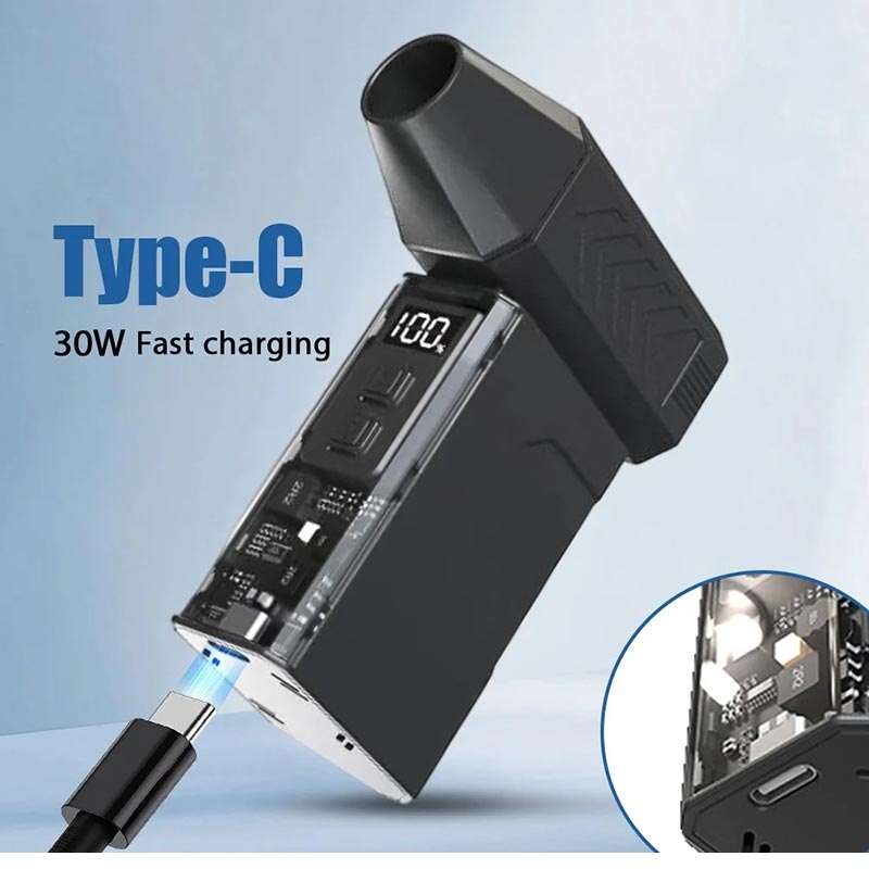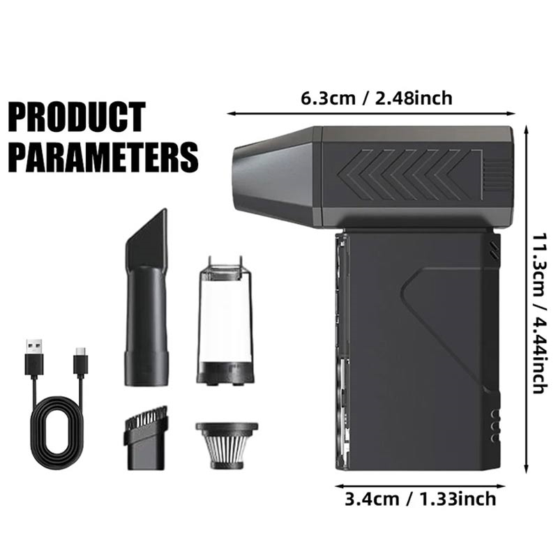 The 2-in-1 Jet Turbo Blower and Vacuum Cleaner is a compact, high-speed cleaning tool designed for fast dust removal and everyday cleanup. Switch between powerful air blasting and vacuum suction to handle different tasks around your home, car, or workspace. With 100 speed levels and a large 8000 mAh battery, you can fine-tune the airflow or suction and keep going for long sessions when needed.