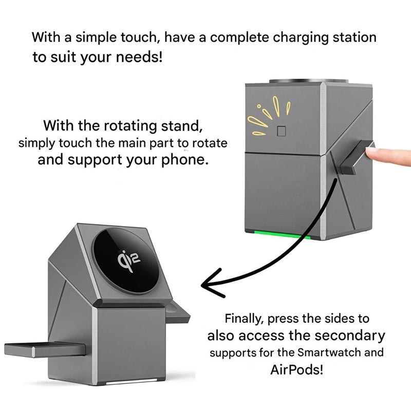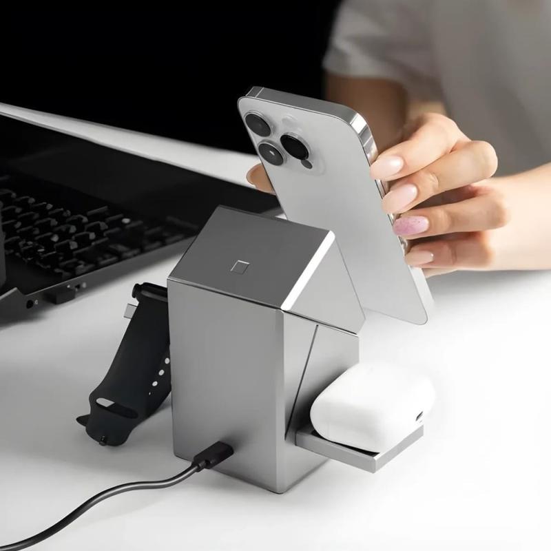 The Qi2 magnetic wireless charger 15W is a refined 3-in-1 charging solution designed for modern Apple users who value both performance and design. Its engineered rotatable construction allows the charger to transition from a compact cube into a fully functional charging station, creating a clean, elegant setup for everyday use. With fast Qi2 magnetic charging, precise alignment, and a space-saving form, it delivers a seamless charging experience at home, at the office, or while travelling.