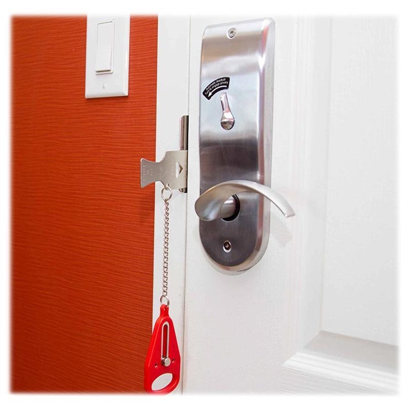 Povećajte svoju bezbednost kod kuće, u hotelu, motelu ili na bilo kom drugom mestu. Ova sigurnosna brava od nerđajućeg čelika se lako montira na vrata i skida sa njih, pri čemu sprečava njihovo otvaranje spolja, čak i upotrebom ključa. Uz to ih štiti čvrsta ABS plastika na samoj bravi.