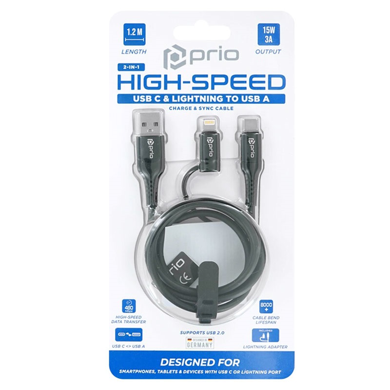 Prio 2-in-1 High-Speed USB-C / Lightning to USB-A Cable - 3A, 480Mbps - 1.2m