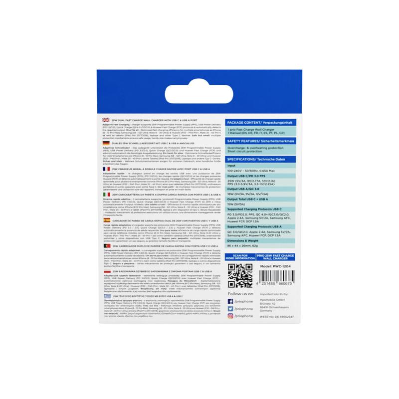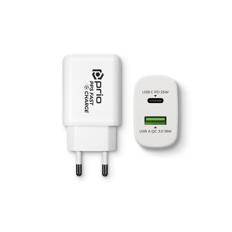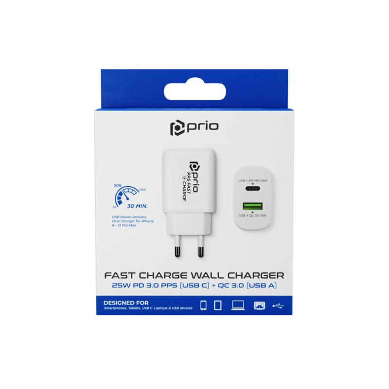 Prio PWC-1204 Fast Wall Charger with 25W PD USB-C, 18W QC3.0 USB-A Ports