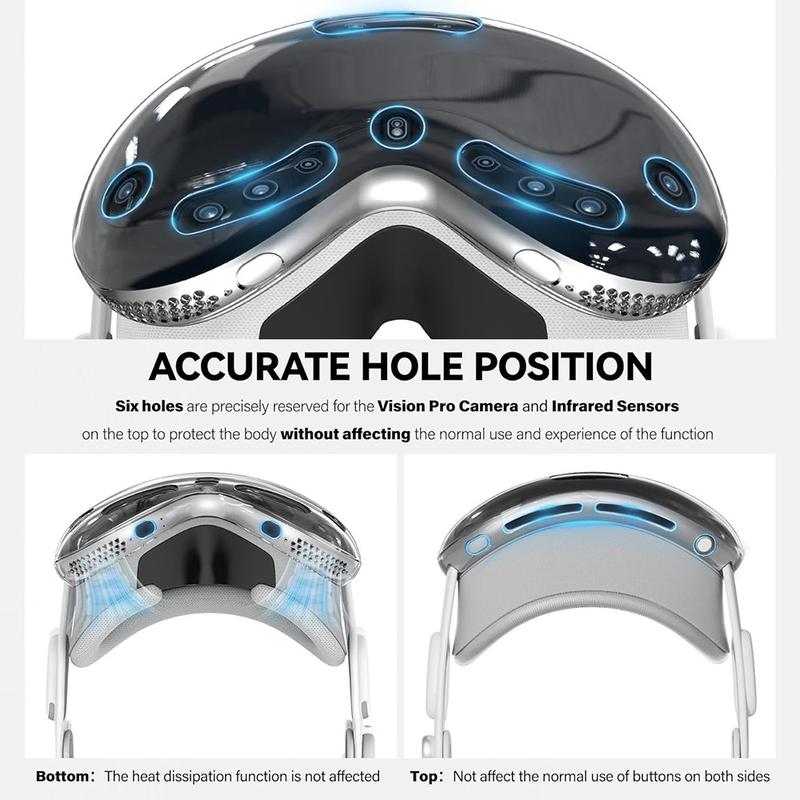Precise hole positions: The transparent shell reserves 6 precise hole positions for Vision Pro's camera and infrared sensor, which will not affect the normal use experience when worn. At the same time, precise hole positions are reserved for the inlet and outlet radiators and buttons, which will not affect the heat dissipation function and normal use of the buttons when worn. Enjoy the visual feast brought by VR while protecting the VR