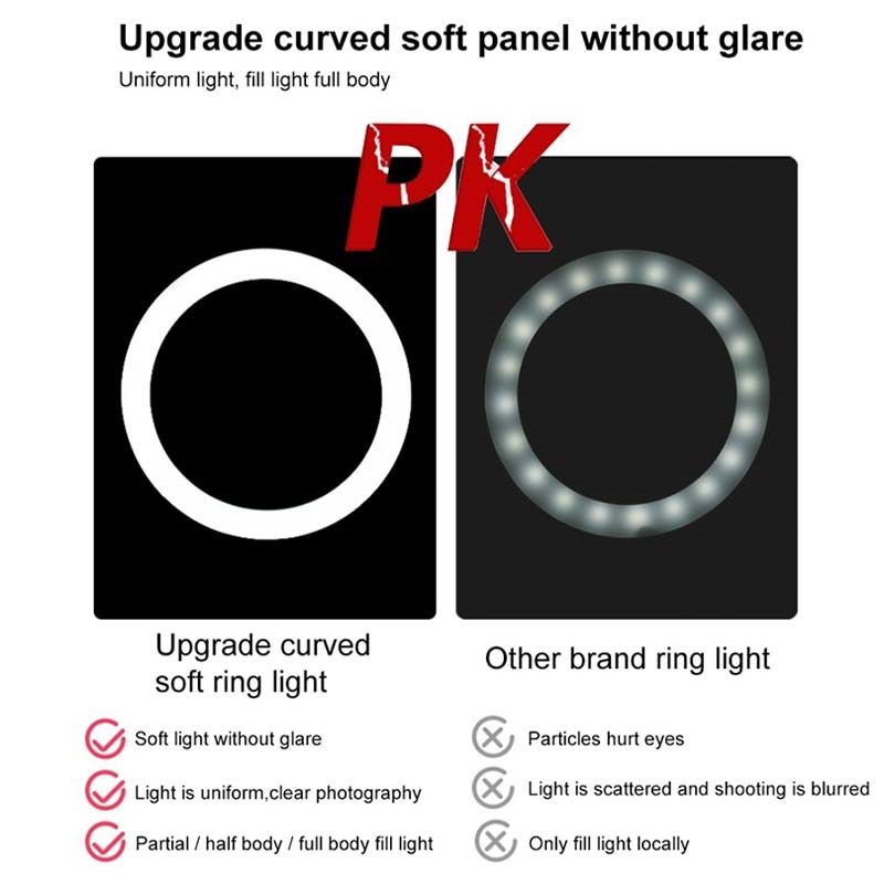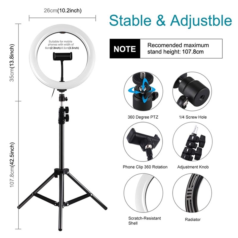 The ring light is made of 2x60pcs energy-saving LED beads, it heat dissipation is excellent, constant current drive and high color rendering, soften the light source and enhance skin tone in portraits photography
