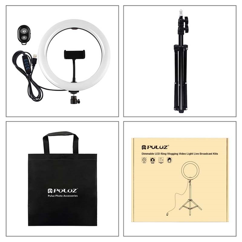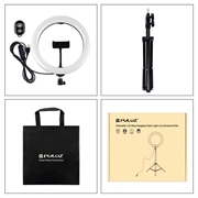PULUZ PKT3069B 1.1m Tripod Mount + 10.2" 26cm Dimmable Dual Color Temperature USB LED Ring Lights Selfie Photography Video Fill Light with Phone Clamp & Selfie Remote Control