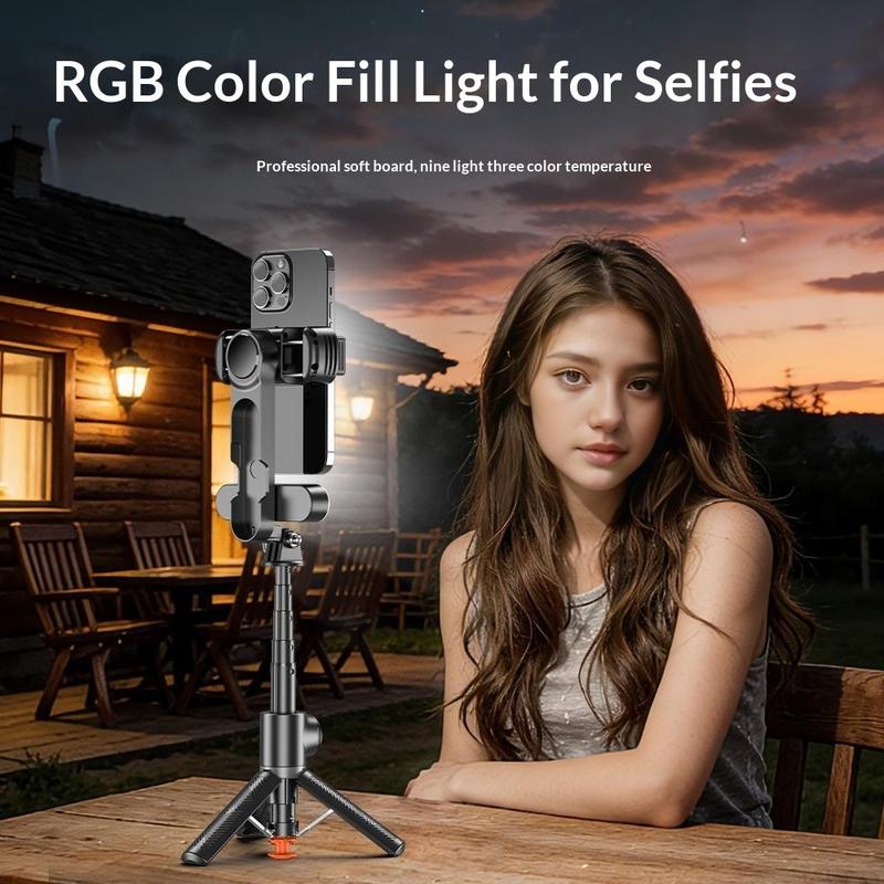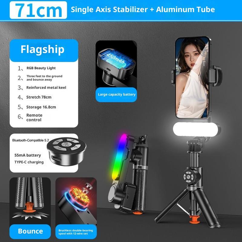 Create more stable and flexible phone content with the Q34 AI anti-shake selfie stick gimbal stabilizer. Designed for live streaming, selfies, video recording, video calls, and everyday content creation, this compact accessory combines a single-axis stabilizer, extendable selfie stick, tripod base, RGB fill light, and wireless remote control in one portable design. With an extension range from 16.8cm to 71cm, it gives you more freedom to adjust framing and shooting distance to suit different scenes.