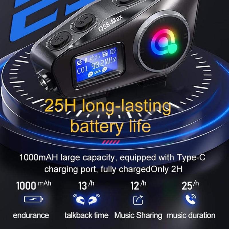 Built for regular outdoor use, the headset has an IPX6 waterproof rating and a detachable dual-clip installation system designed to fit a wide range of helmet styles, including full-face, off-road, half-face, and vintage helmets. The 1000mAh battery supports up to 25 hours of music playback or talk time, up to 15 hours of intercom use, and up to 300 hours of standby time. With Type-C charging, TF card support, and a hard microphone included, the Q58Max is a practical choice for riders who want a feature-rich helmet communication system.