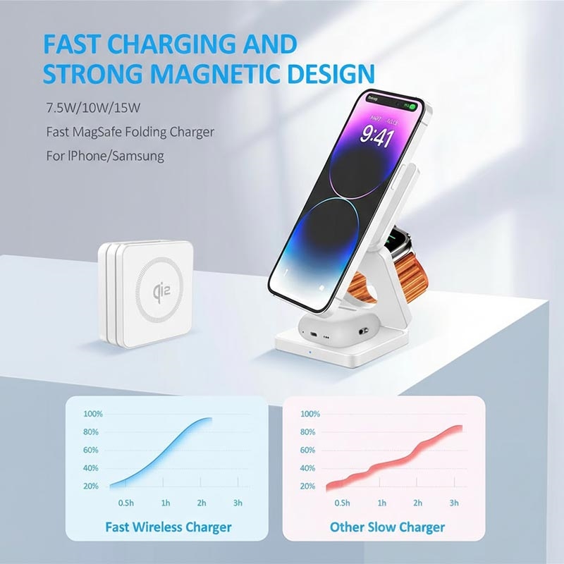 This charger simplifies daily charging by combining three charging zones into one foldable stand. Qi2 magnetic alignment improves convenience and efficiency for compatible phones, while built-in protection features add peace of mind. A smart choice for anyone who wants a cleaner setup at home and a compact charging solution for travel.