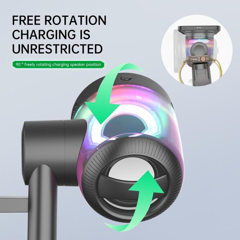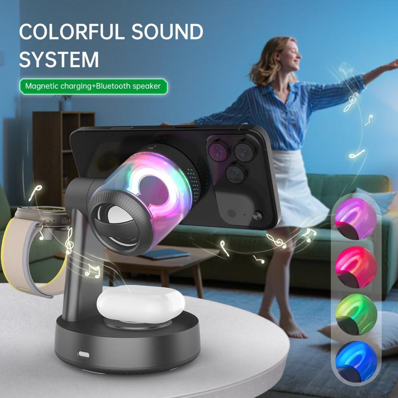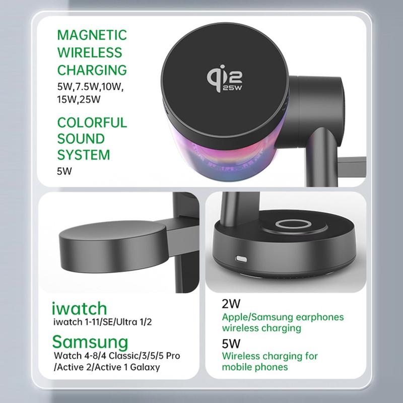 QI2.2 25W Magnetic Wireless Charging Station with Bluetooth Speaker & RGB Ambient Lighting - 3-in-1 Charger for Phone, Earbuds & Smartwatch