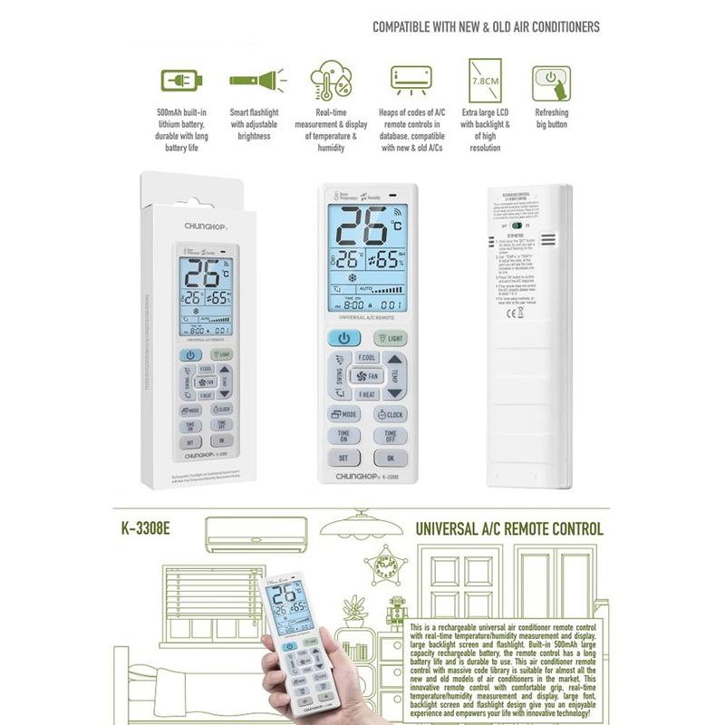 Investing in the CHUNGHOP K-3308E eliminates the inconvenience of juggling multiple AC remotes or searching for specific brand replacements. The rechargeable battery saves money and cuts down on waste, while the real-time temperature and humidity display empowers you to keep conditions just right. Compact and feature-rich, it’s a practical, cost-effective solution for maintaining a comfortable living or working space.