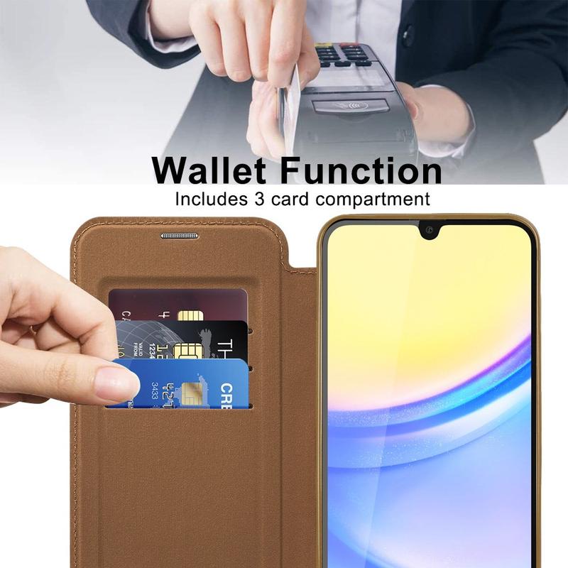 This premium Samsung Galaxy A15 case is crafted with high-quality TPU, Acrylic, and polyurethane, using a fine process to ensure a delicate and exquisite finish. It is equipped with a convenient card slot for easy swiping and spending on the go, and features a strong magnet for automatic closing, making it safe and convenient to manage items inside. This Samsung Galaxy A15 case provides effective protection against daily wear and tear, scratches, marks, and scrapes, while the advanced RFID blocking technology in the card slot ensures your personal information is protected from theft. Additionally, the built-in magnetic ring is compatible with MagSafe wireless charging, meaning you can charge your Samsung Galaxy A15 without taking off the case.