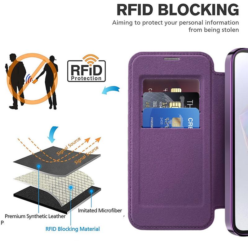 This premium Samsung Galaxy A35 case is crafted with high-quality TPU, Acrylic, and polyurethane, using a fine process to ensure a delicate and exquisite finish. It is equipped with a convenient card slot for easy swiping and spending on the go, and features a strong magnet for automatic closing, making it safe and convenient to manage items inside. This Samsung Galaxy A35 case provides effective protection against daily wear and tear, scratches, marks, and scrapes, while the advanced RFID blocking technology in the card slot ensures your personal information is protected from theft. Additionally, the built-in magnetic ring is compatible with MagSafe wireless charging, meaning you can charge your Samsung Galaxy A35 without taking off the case.