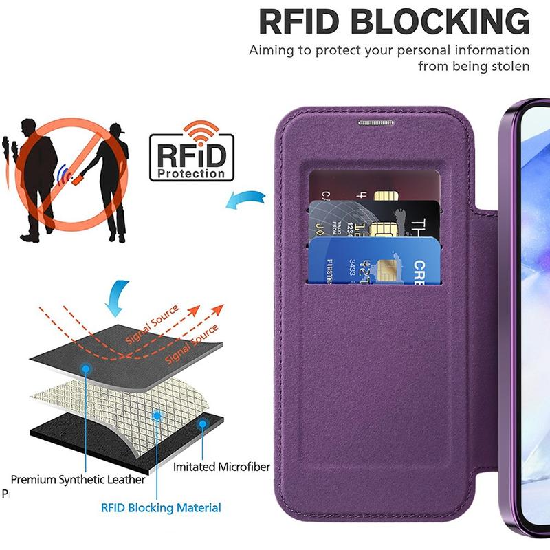 This premium Samsung Galaxy A55 case is crafted with high-quality TPU, Acrylic, and polyurethane, using a fine process to ensure a delicate and exquisite finish. It is equipped with a convenient card slot for easy swiping and spending on the go, and features a strong magnet for automatic closing, making it safe and convenient to manage items inside. This Samsung Galaxy A55 case provides effective protection against daily wear and tear, scratches, marks, and scrapes, while the advanced RFID blocking technology in the card slot ensures your personal information is protected from theft. Additionally, the built-in magnetic ring is compatible with MagSafe wireless charging, meaning you can charge your Samsung Galaxy A55 without taking off the case.