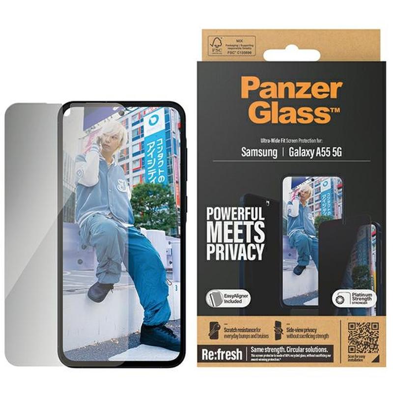 - PanzerGlass Ultra-Wide Fit Privacy EasyAligner zaštitnik ekrana NIJE kompatibilan sa Samsung Galaxy A55 senzorom otiska prsta
