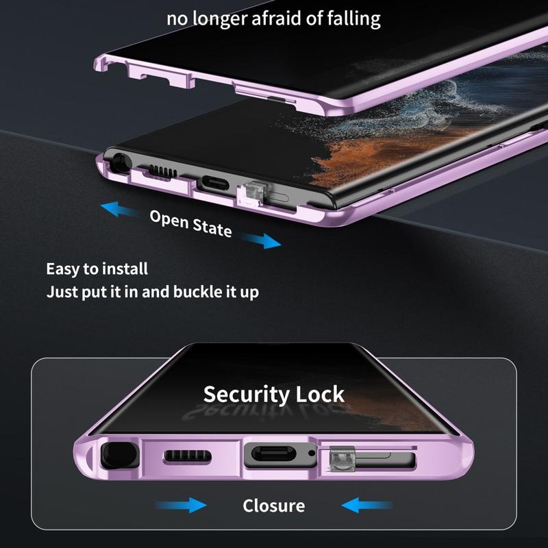 Dizajn iz dva dela nudi lako pričvršćivanje i sigurno zaključavanje zahvaljujući magnetima i kopči. Ugrađeno prednje kaljeno staklo štiti ekran od ogrebotina i udaraca, bočni metalni okvir od udaraca i padova, dok mat kompozitni materijal štiti zadnju stranu Samsung Galaxy S23 Ultra 5G.