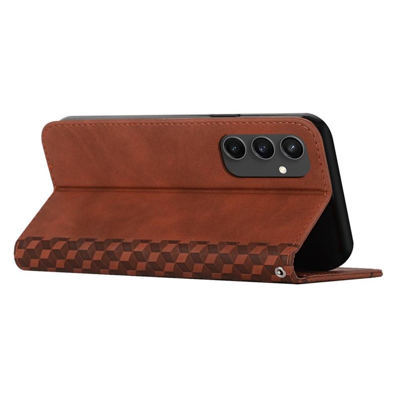 Protect your Samsung Galaxy S24 FE in style with this premium polyurethane Rhombus Pattern case, designed for durability and convenience. Featuring a sleek finish, this case is equipped with a magnetic closure to keep your phone secure while offering quick access. The built-in stand function allows you to enjoy hands-free viewing, making it ideal for streaming, video calls, or browsing. The elegant PU leather design not only adds sophistication but also provides reliable protection against scratches, bumps, and drops, ensuring your device stays in perfect condition.