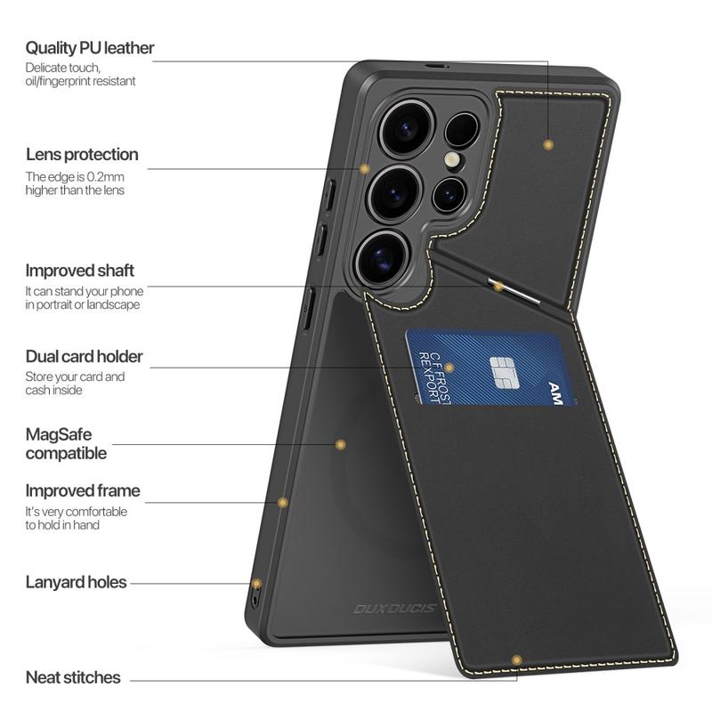 Keep your Samsung Galaxy S25 Ultra safe and stylish with the Dux Ducis Rafi II Series Magnetic Case. This premium case combines a sleek leather finish with a durable TPU interior for comprehensive protection. Designed for functionality, it includes a built-in kickstand, magnetic closure, and card slots, making it ideal for users who need both convenience and elegance.