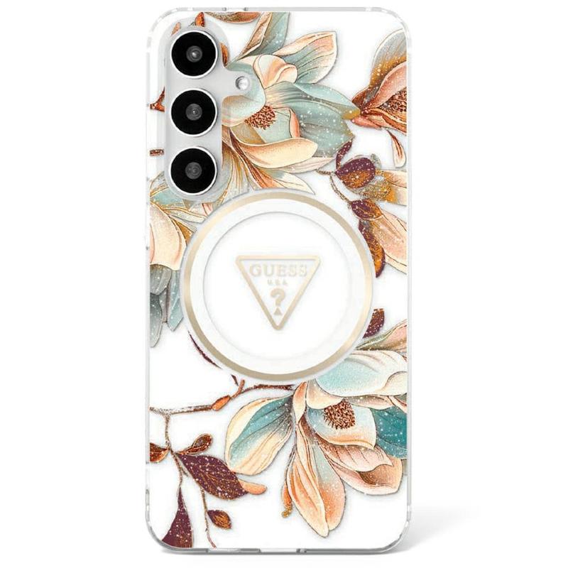 Protect your Samsung Galaxy S25 in style with the Guess Glitter Flowers Triangle Buttons MagSafe Case, combining modern design, durability, and wireless charging convenience.