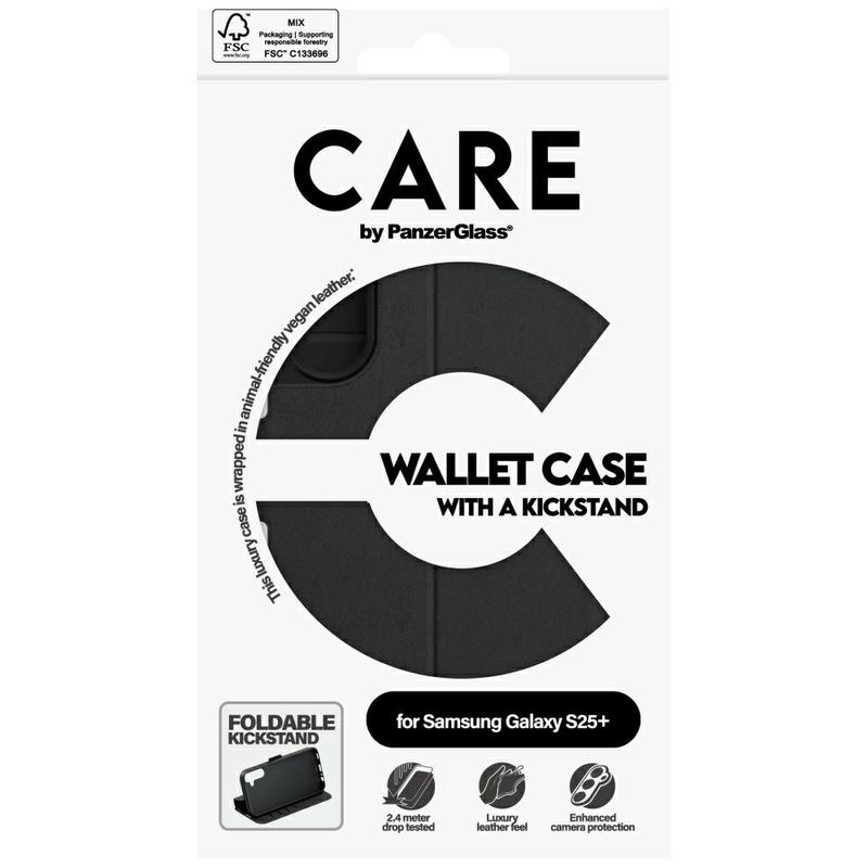Elevate your Samsung Galaxy S25+ experience with the CARE by PanzerGlass Feature Wallet Case, designed to offer premium protection, functionality, and style. This slim yet durable wallet case provides a luxurious leather-like feel, ensuring your device remains safeguarded while exuding elegance.