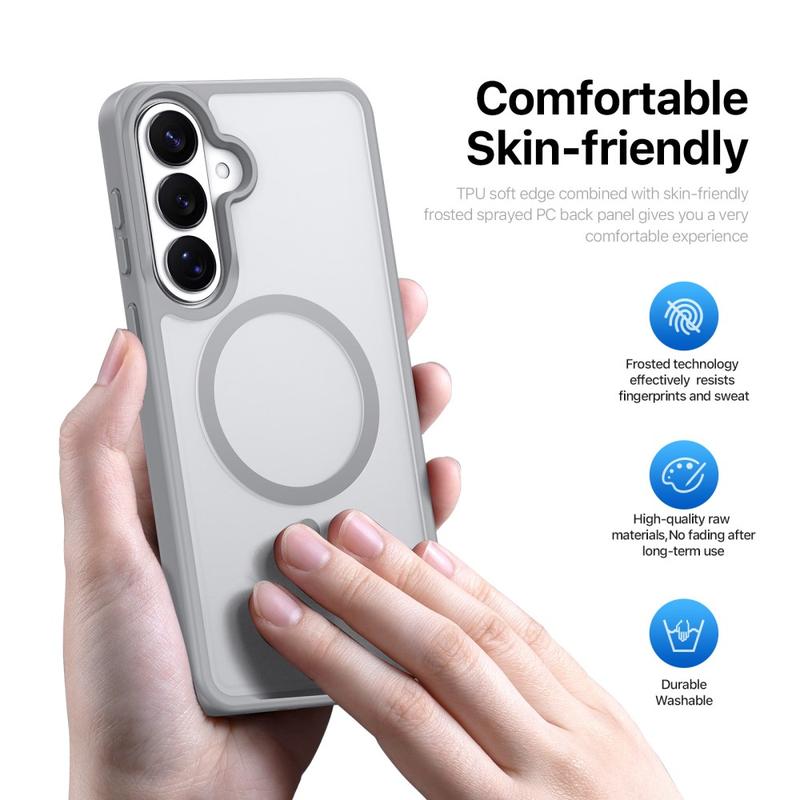 Protect your Samsung Galaxy S26 with a sleek matte cover that clicks straight onto MagSafe chargers and accessories. The Yind Series pairs a scratch-resistant PC backplate with shock-absorbing TPU edges and a precision-aligned magnetic ring, delivering cable-free power and all-round drop protection without bulky pockets.