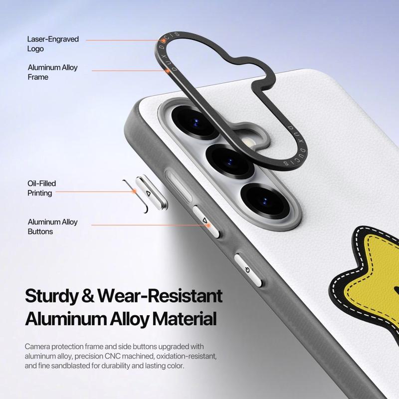 The camera protection frame and side buttons are made from aluminum alloy, precisely CNC-machined and finished with fine sandblasting. This ensures long-lasting colour, durability and a premium feel, enhanced with subtle laser-engraved details.