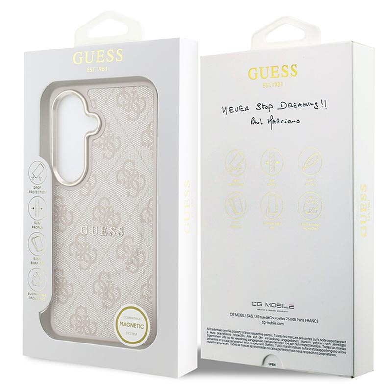 Upgrade your everyday look and protect your phone with the Guess 4G Gold Frame MagSafe case for Samsung Galaxy S26. Designed to match both your style and your routine, this slim back cover combines a premium fashion finish with reliable daily protection. The lightweight polyurethane build feels comfortable in hand, while the grippy surface helps reduce slipping. With MagSafe support, you can keep using wireless charging and MagSafe accessories without removing the case.