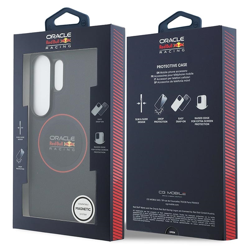 Bring racing energy to your everyday carry with the Oracle Red Bull Racing PU Meshed Red Ring magnetic case for Samsung Galaxy S26 Ultra. Inspired by the speed-focused world of motorsport, this premium case combines a protective PC and TPU structure with an polyurethane surface for a bold look and comfortable grip. The distinctive red ring and meshed styling deliver standout design, while the integrated magnetic function makes it easy to use with magnetic holders, for example in the car.