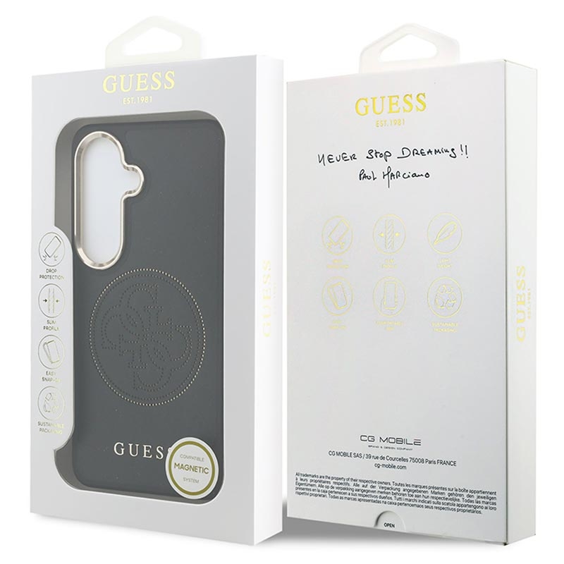 Give your Samsung Galaxy S26 a premium fashion look with reliable everyday protection. The Guess Perforated 4G Logo MagSafe Case combines durable PU with fine perforation and the signature 4G pattern to elevate your style while keeping your phone protected. Designed to fit the Samsung Galaxy S26 precisely, it helps guard against scratches, dust, and accidental drops, while keeping all buttons and ports easy to access. MagSafe support means you can use wireless charging and MagSafe accessories without removing the case.