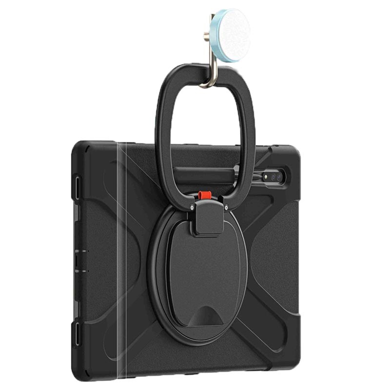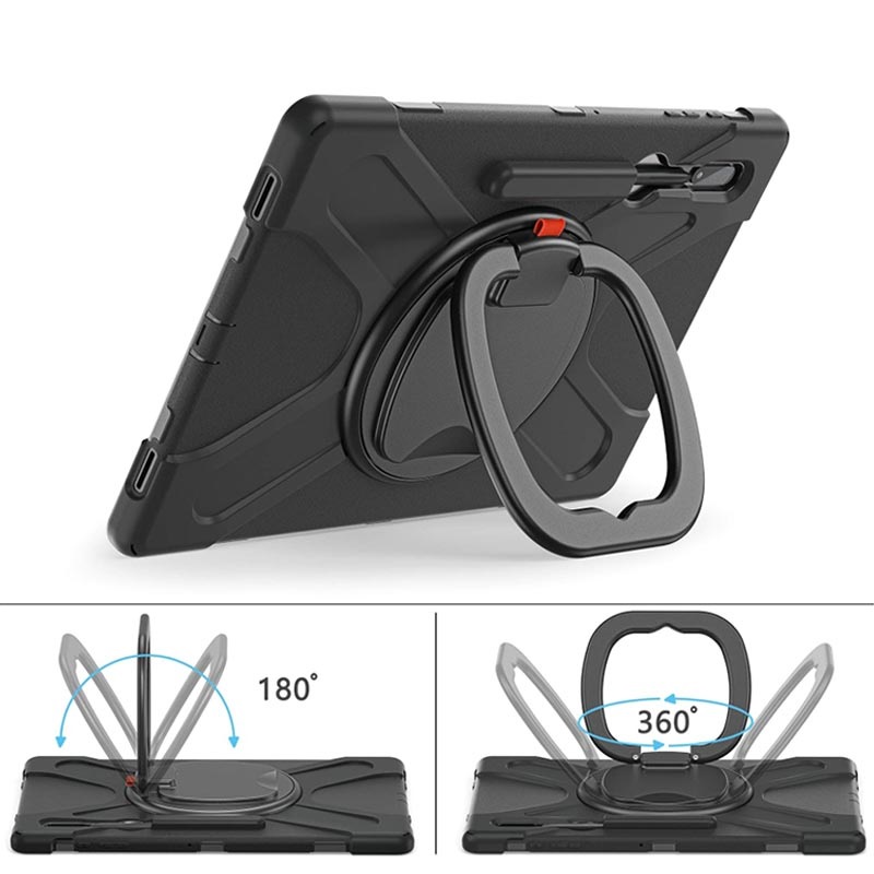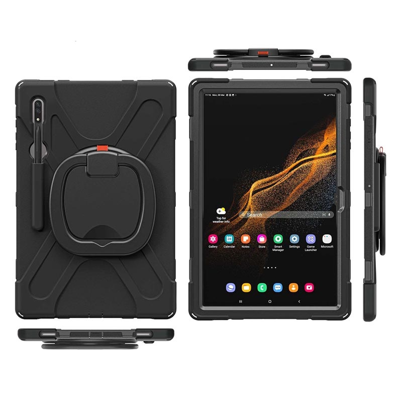 Made of 3 layers of protection, this case protects your Samsung Galaxy Tab S8 Ultra from everyday bumps, scratches, and fingerprints. This case extends its usage with a 360-degree rotary kickstand! You can watch your media hands-free from different angles and you can hang your Samsung Galaxy Tab S8 Ultra on a kitchen cabinet for recipe viewing, or other places. It comes with a shoulder strap, for extra portability and security. A rubber port plug keeps your port safe from dust or unwanted liquid.