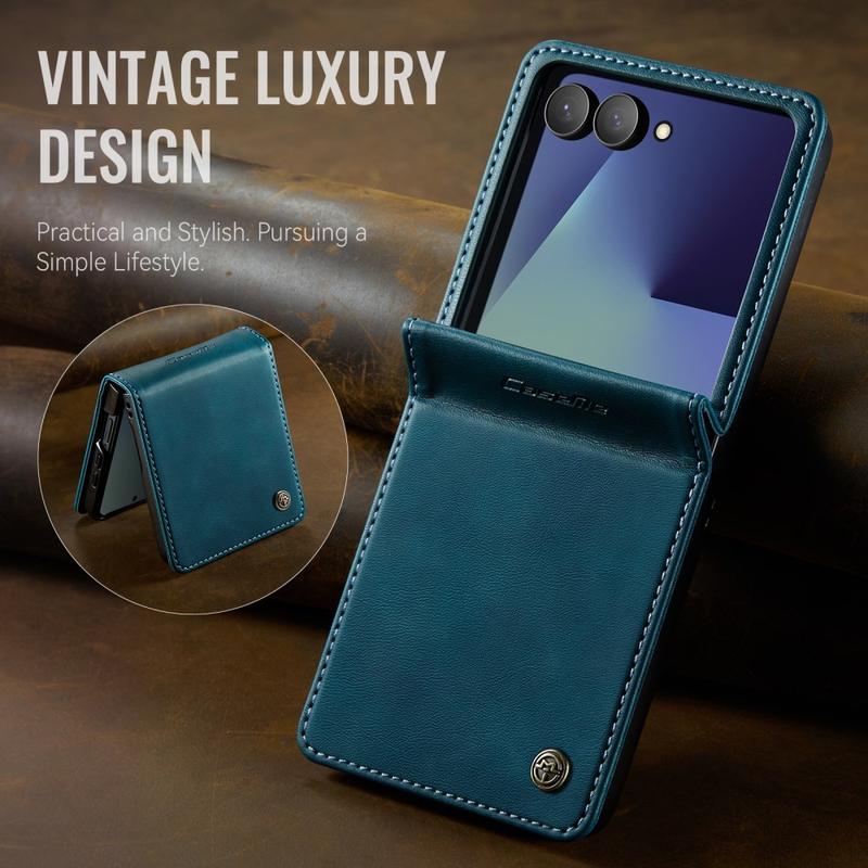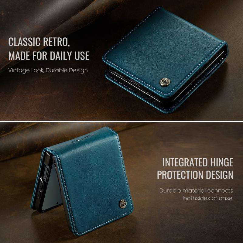 The CASEME 033 Series Wallet Case for Samsung Galaxy Z Flip7 is crafted from calf texture polyurethane combined with TPU, offering full-body protection against scratches, impacts, and daily wear while maintaining a premium, elegant look.