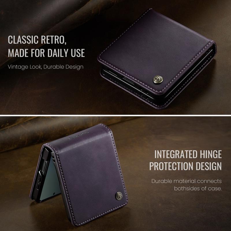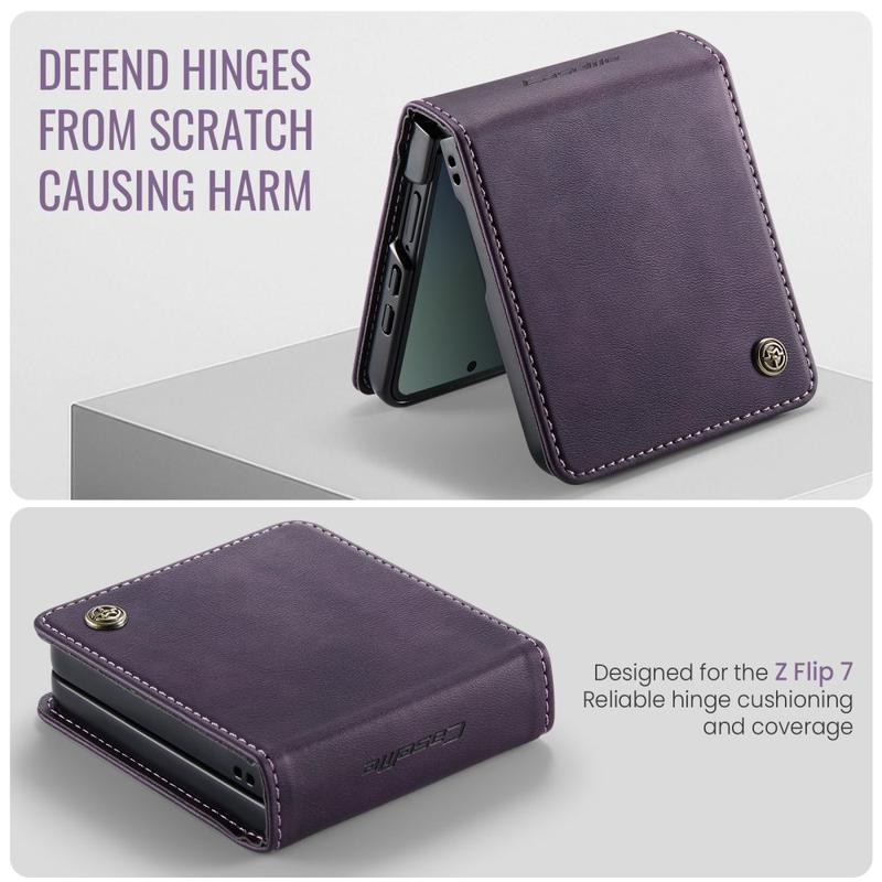 The CASEME 033 Series Wallet Case for Samsung Galaxy Z Flip7 is crafted from calf texture polyurethane combined with TPU, offering full-body protection against scratches, impacts, and daily wear while maintaining a premium, elegant look.