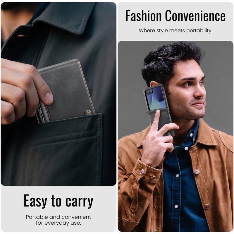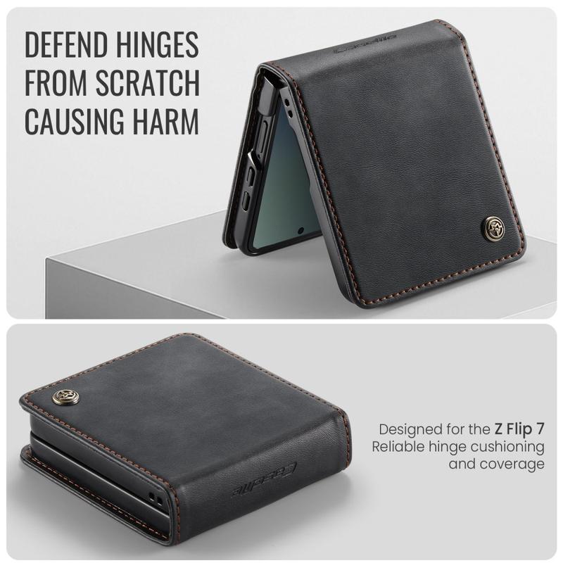 The CASEME 033 Series Wallet Case for Samsung Galaxy Z Flip7 is crafted from calf texture polyurethane combined with TPU, offering full-body protection against scratches, impacts, and daily wear while maintaining a premium, elegant look.
