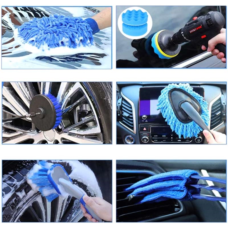 This all-inclusive kit provides you with everything you need to keep both the interior and exterior of your vehicle immaculate. It contains 5 detailing brushes, 4 drill brush attachments, 3 wire brushes, 3 polishing sponges, 2 air outlet brushes, 2 scouring pads, 1 car wash mitt, 1 towel, and 1 set of adhesive discs.