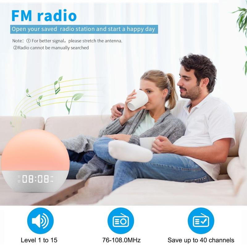 - Sunrise wake-up light that gradually increases brightness for a gentler start to the day