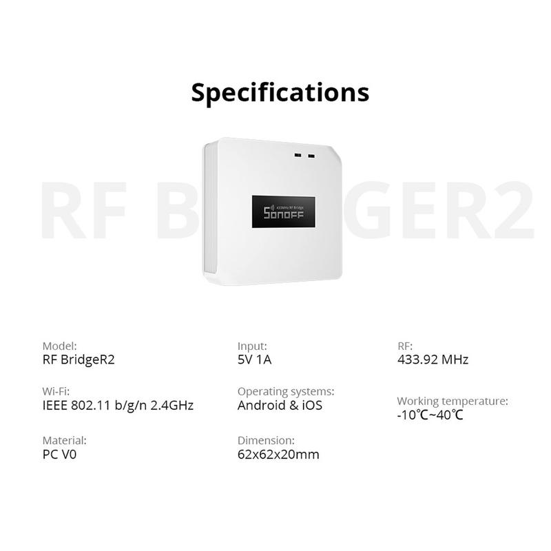 Bring your 433MHz RF devices into your WiFi smart home with the Sonoff RF BridgeR2. This compact smart hub acts as a bridge between RF 433.92 MHz sensors and remotes and your WiFi network, letting you manage compatible devices from your phone through the eWeLink app. Use it to simplify control of multiple RF devices, create automation scenes, and receive notifications for security events like door openings or motion detection.