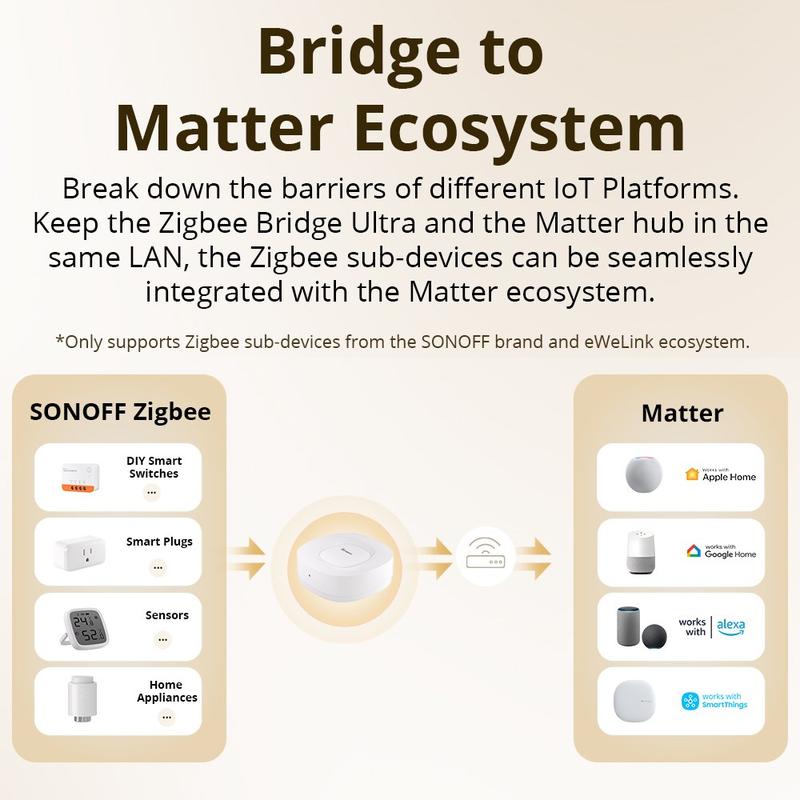 Unify your smart home ecosystem with the Sonoff ZBBridge-U Zigbee Bridge Ultra. This advanced gateway connects Zigbee 3.0 devices to your WiFi network and supports Matter bridge functionality, allowing compatible Zigbee devices to integrate seamlessly across different smart home platforms. With both WiFi and wired Ethernet options, it delivers flexible and stable connectivity for reliable automation, security, and voice control.