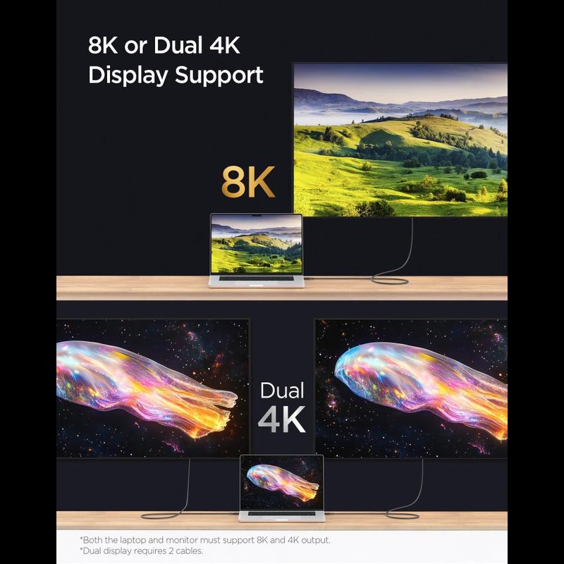 Thanks to compatibility with Thunderbolt 3 and 4, the cable also supports advanced video output—8K (single screen) and 4K (dual screens) via DisplayPort 2.0. This makes it perfect for connecting laptops or docking stations to high-resolution monitors.