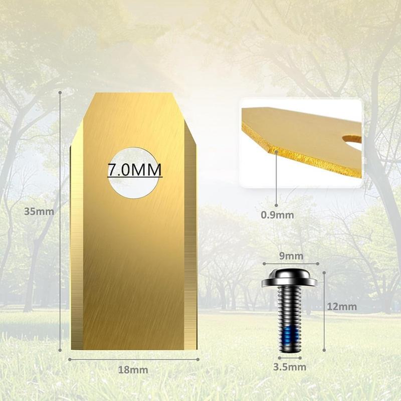 With precise 35 x 18 x 0.9mm dimensions and a 7.0mm mounting hole, the blades are made for a secure fit on compatible models. The dual-edge cutting design helps support efficient grass trimming, while the included screws with blue thread-locking compound help keep the blades firmly attached during operation. This complete set is a practical solution for regular mower maintenance and long-term cutting performance.
