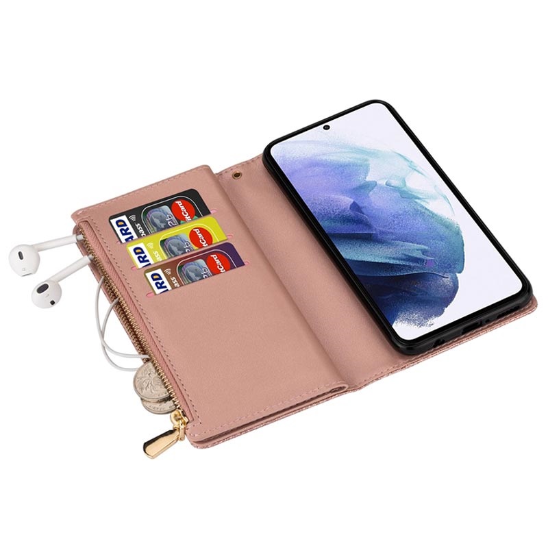 The most elegant way to carry your Samsung Galaxy S22 5G is shielded with this sparkling wallet case. It provides excellent all-around protection, while the strong magnetic closure keeps all your valuables and your Samsung Galaxy S22 5G secured. The case features multiple card slots and a large zipper pocket, while the foldable back doubles as a stand for convenient media watching. This stylish wallet case for Samsung Galaxy S22 5G comes with a handy lanyard for extra safety in crowded places.