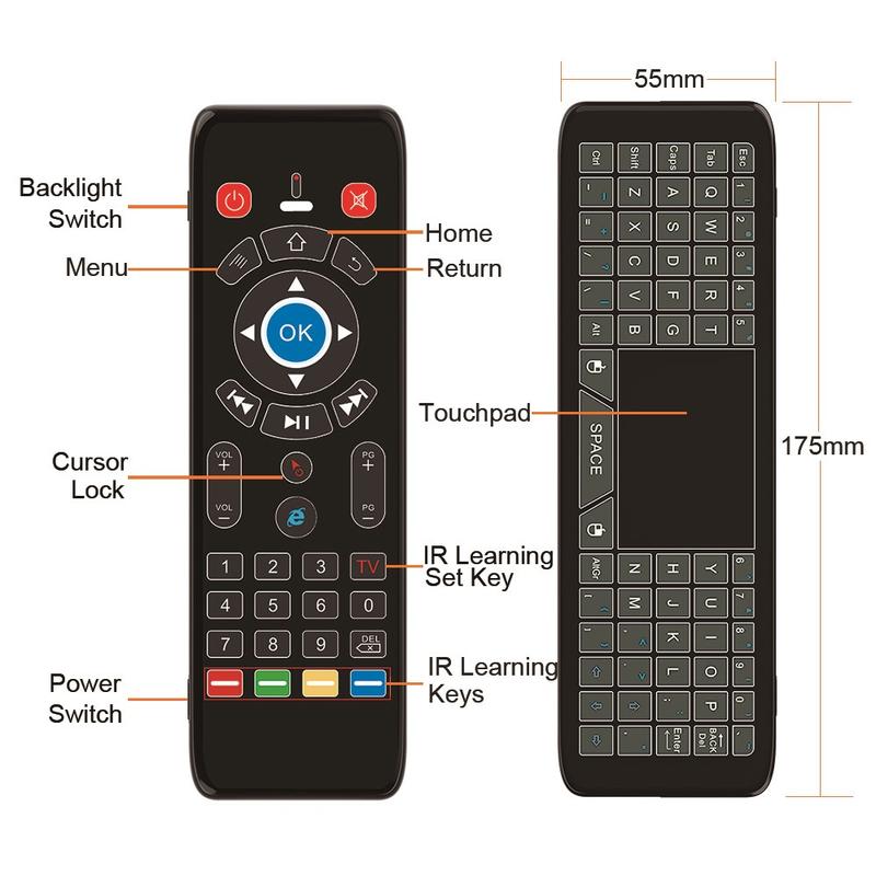 - Control Functions: Gyroscope air mouse, touchpad, QWERTY keyboard, IR learning