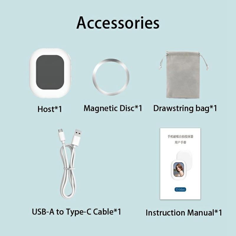 T3 Mini wireless phone screen mirroring device is a compact and practical accessory designed to make selfies, vlogging, content creation, and rear camera shooting easier. With instant magnetic attachment, wireless screen mirroring, and a bright 2.01-inch IPS display, it helps you preview your phone s rear camera in real time without complicated setup. Its lightweight design makes it easy to carry anywhere, making it a useful tool for everyday photos, short videos, livestreams, and travel content.