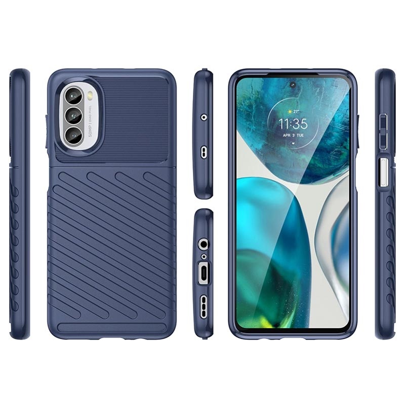 Shield your Motorola Moto G52, Moto G82 using this flexible TPU cover! Made of Eco-friendly thermoplastic polyurethane, it protects Motorola Moto G52, Moto G82 from impacts, scratches, wear, and dirt. Raised edges around the display and camera protect them additionally. Snap it on in no time and enjoy the feel of a rugged Thunder Series TPU case.