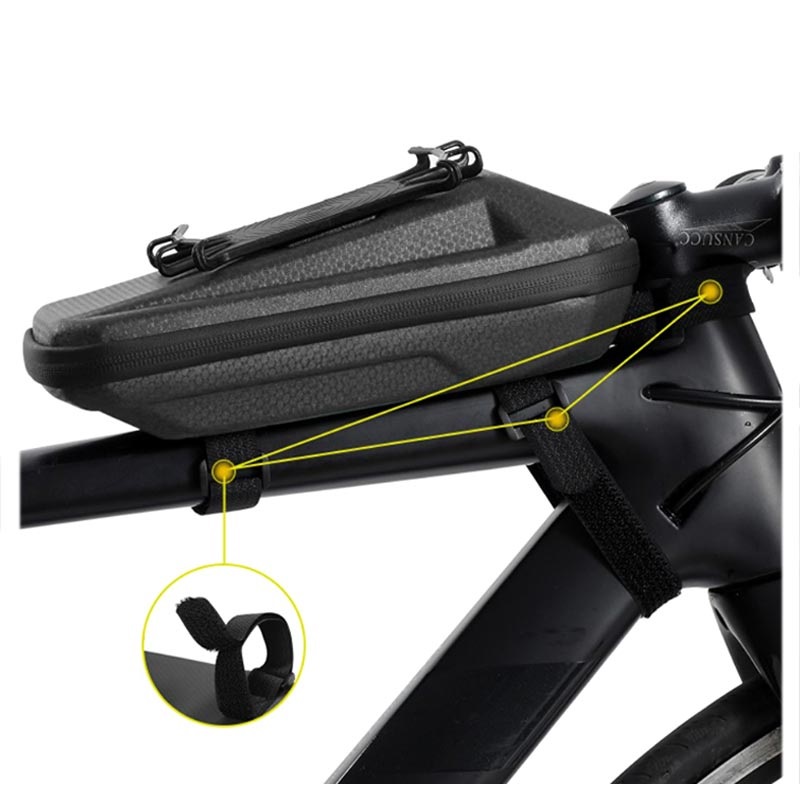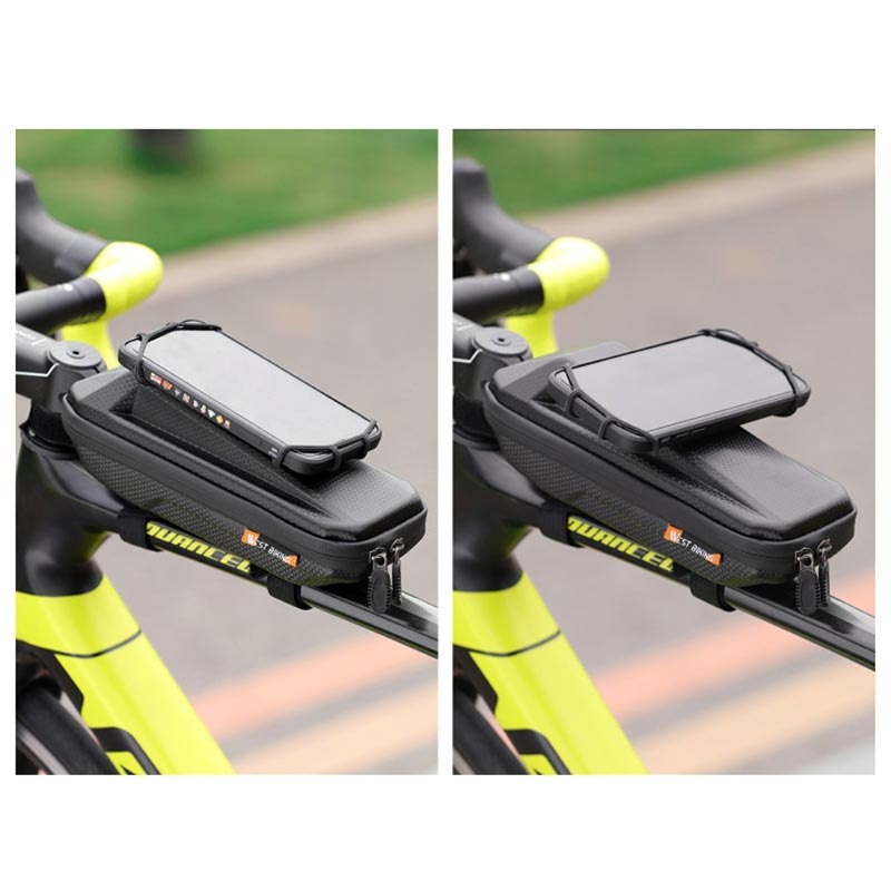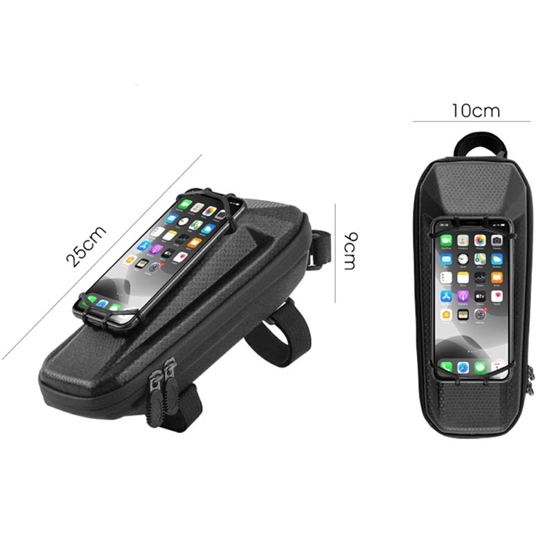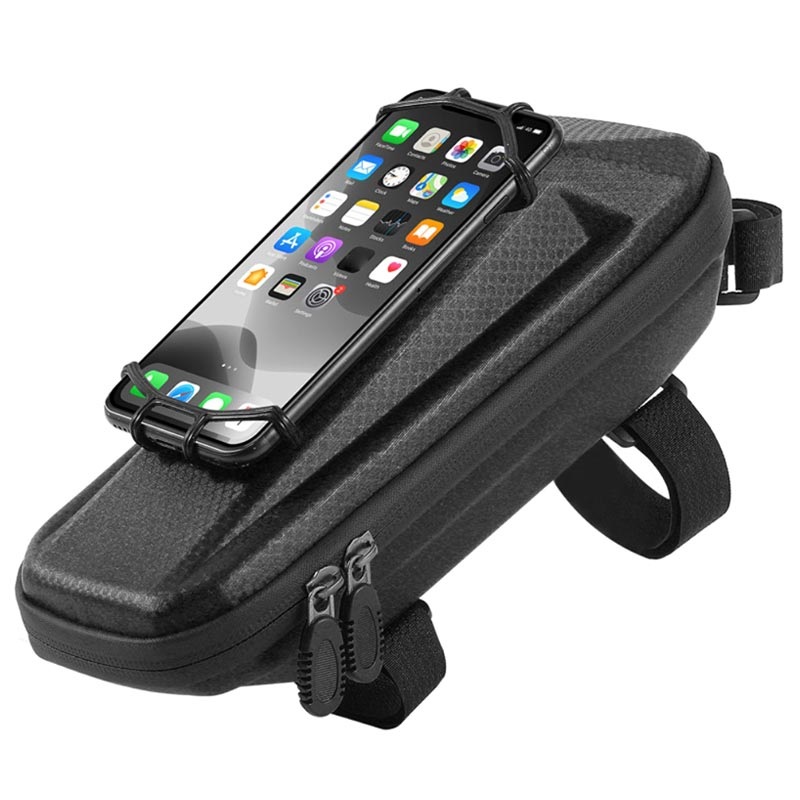 Kompaktna konstrukcija je izrađena od vodootpornog EVA materijala na kojoj se nalazi bezbedni silikonski držač za telefon. Precizni dizajn sprečava udaranje torbice prilikom vožnje, dok je čičak-traka kompatibilna sa većninom tipova bicikala. Vaše stvari i telefon će biti bezbedne uz ovu torbicu sa rotacionim držačem za telefon od 360 stepeni!
