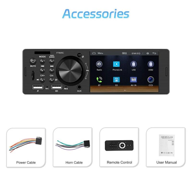 Transform an ageing dashboard into a smart-phone hub with this slim F7805C head-unit. The 10.4 cm (4.1 in) capacitive display handles wired CarPlay, Android Auto and Mirror Link, so you can follow maps, take calls and stream playlists without fumbling with your phone. Bluetooth 5.1 keeps conversations crisp, while a 7-colour back-light lets you match factory illumination. Designed for 12 V systems and weighing under 0.4 kg, it slips into most single-DIN slots with minimal wiring.