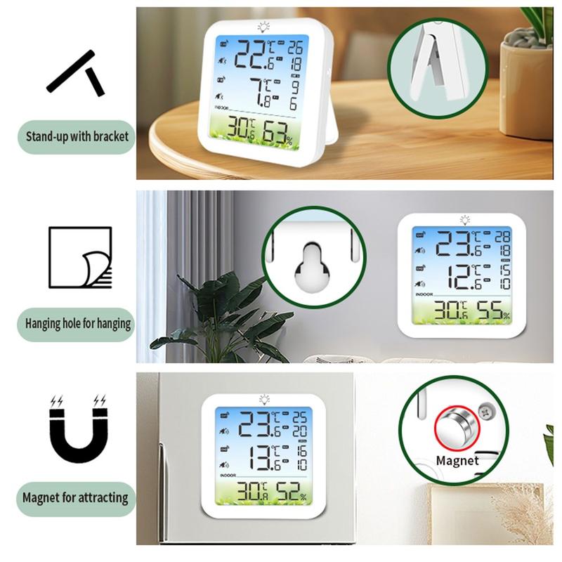 The clear display shows temperature and humidity data, while the customizable high and low alarm helps alert you when readings move outside your set range. With wireless transmission up to 100m in open areas, 24-hour max/min recording, and flexible placement options, it is a useful solution for home, commercial, and storage monitoring.